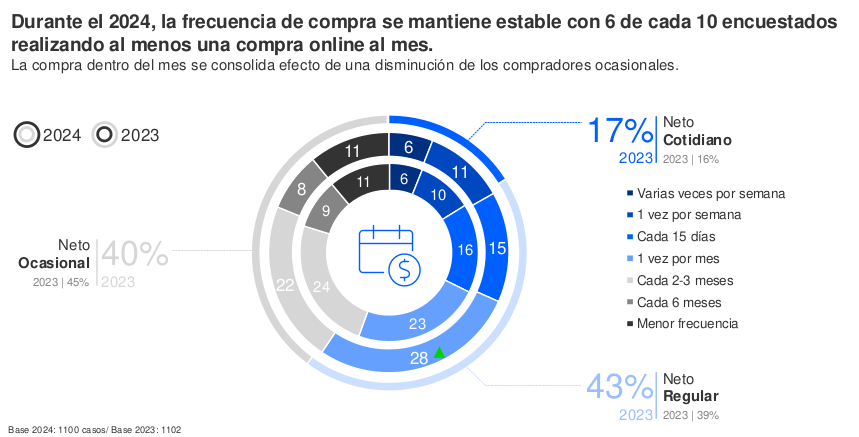 La frecuencia de compra se mantiene constante, con 6 de cada 10 usuarios realizando al menos una compra online al mes. El gráfico te muestra cómo se ha consolidado la compra dentro del mes en comparación con el año anterior.