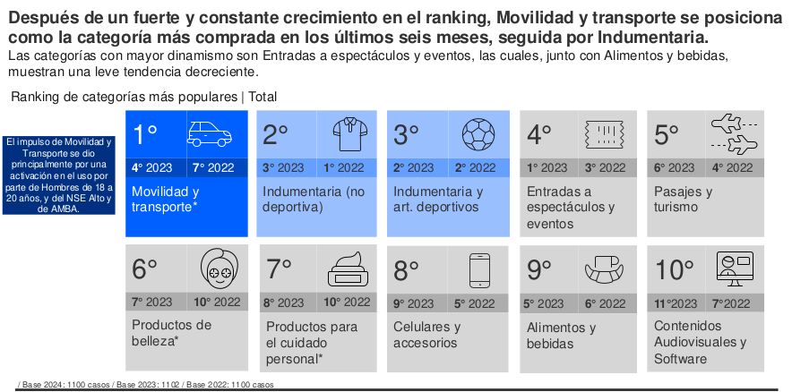 En cuanto a qué están comprando online los argentinos, movilidad y transporte se ha consolidado como la categoría más popular en los últimos seis meses, seguida de cerca por Indumentaria. Es interesante notar el dinamismo de categorías como Entradas a espectáculos y eventos, aunque muestran una leve tendencia decreciente. Si estás pensando en qué ofrecer en tu tienda, estas categorías pueden darte una buena idea de la demanda actual.