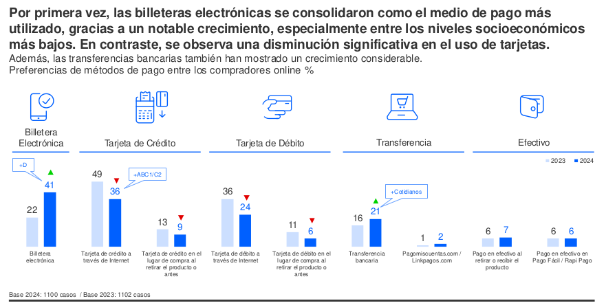 En cuanto a los medios de pago, las billeteras electrónicas se han consolidado por primera vez como el método más utilizado. A pesar de esto, la financiación en cuotas sigue siendo altamente relevante para 8 de cada 10 compradores.