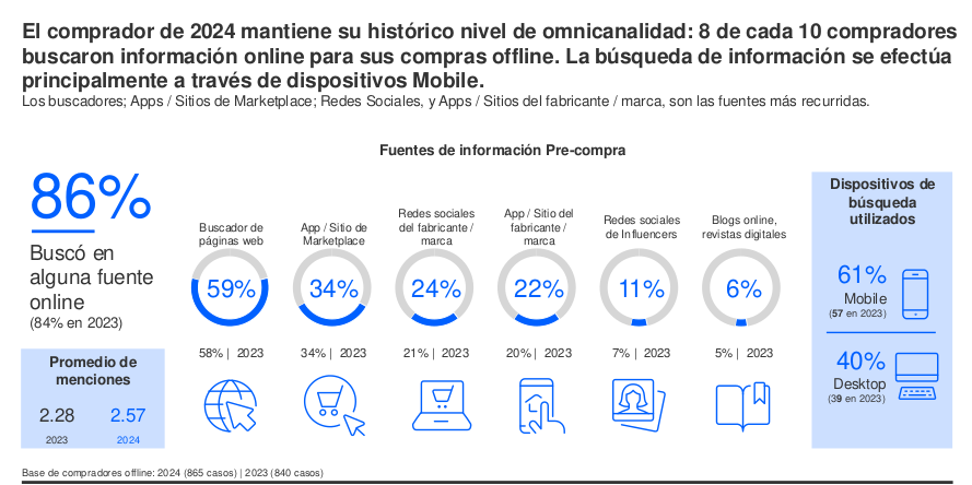 El camino hacia la compra online también nos deja información valiosa. Los compradores buscan información principalmente a través de buscadores web, aplicaciones y sitios de marketplaces, y sitios web de fabricantes/marcas. La información que más buscan es sobre los productos, precios y promociones. Esto te ayudará a entender la importancia de estar presente en estos canales.